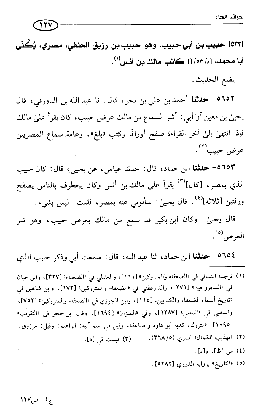5653 - حَدثنا ابن حماد، قال: حَدثنا عباس، عن يَحيى، قال: كان حبيب الذي بمصر كان يقرأ على مالك بن أنس وكان يخطرف بالناس يصفح ورقتين ثلاثة. قال يَحيى: سألوني عنه بمصر فقلت: ليس بشَيءٍ.
