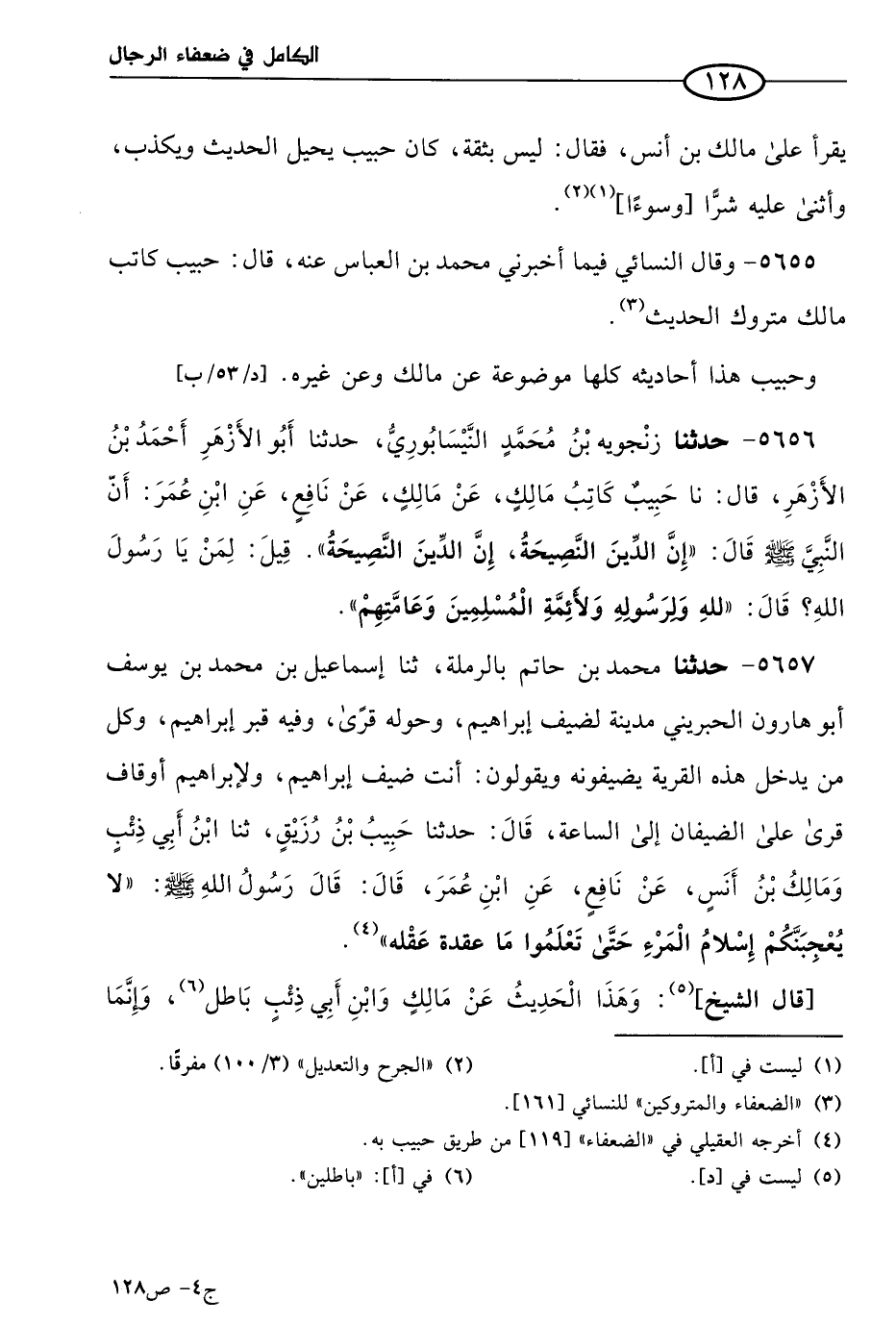 5655 - وقال النَّسائي، فيما أخبرني مُحمد بن العباس عنه، قال: حبيب كاتب مالك متروك الحديث، وحبيب هذا أحاديثه كلها موضوعة عن مالك وعن غيره.