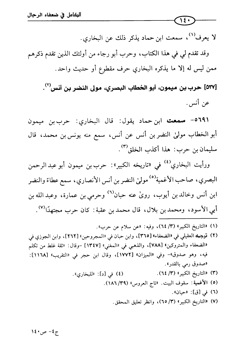 5691 - سمعتُ ابن حماد يقول: قال البُخاري: حرب بن ميمون أَبو الخطاب، مولى النضر بن أنس، عن أَنَس، سمع منه يونُس بن مُحمد، قال سليمان بن حرب: هذا أكذب الخلق.