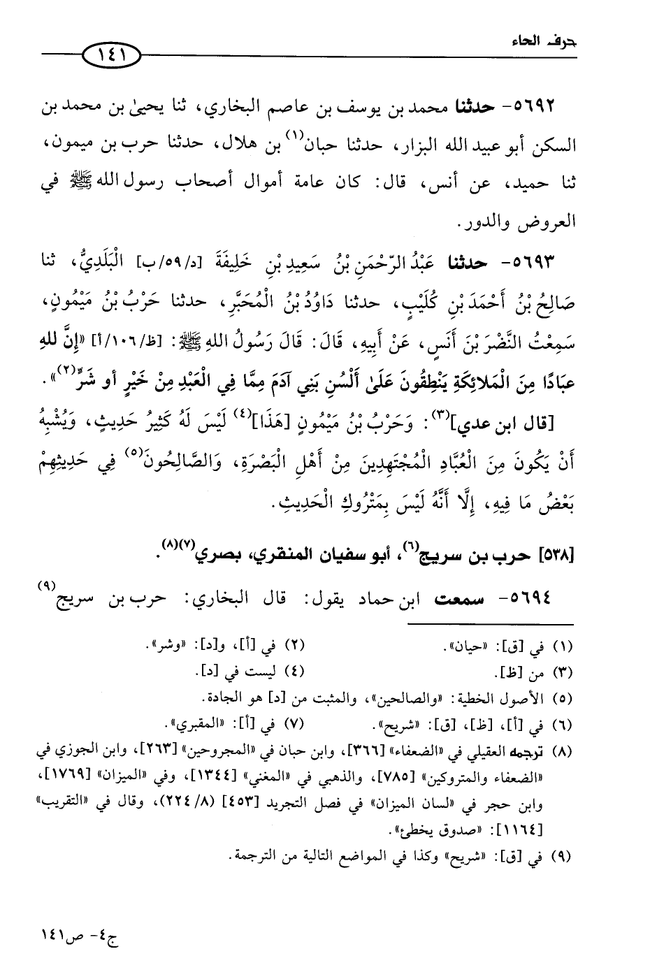 5694 - سمعتُ ابن حماد يقول: قال البُخاري: حرب بن سريج أَبو سفيان المنقري بصري، روى عنه ابن المبارك، كناه زيد بن الحباب، فيه نظر.