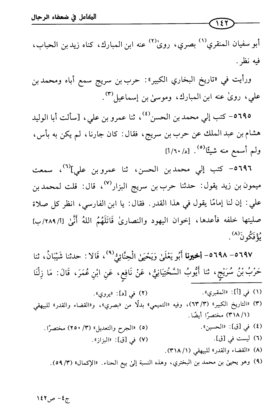 5696 - كتب إلي مُحمد بن الحسن، حَدثنا عَمرو بن علي سمعت ميمون بن زيد يقول: حَدثنا حرب بن سريج البزار، قال: قلتُ لمحمد بن علي: إن لنا إماما يقول في هذا القدر، فقال: يا ابن الفارسي انظر كل صلاة صليتها خلفه فأعدها، إخوان اليهود والنصارى قاتلهم الله أنى يؤفكون.