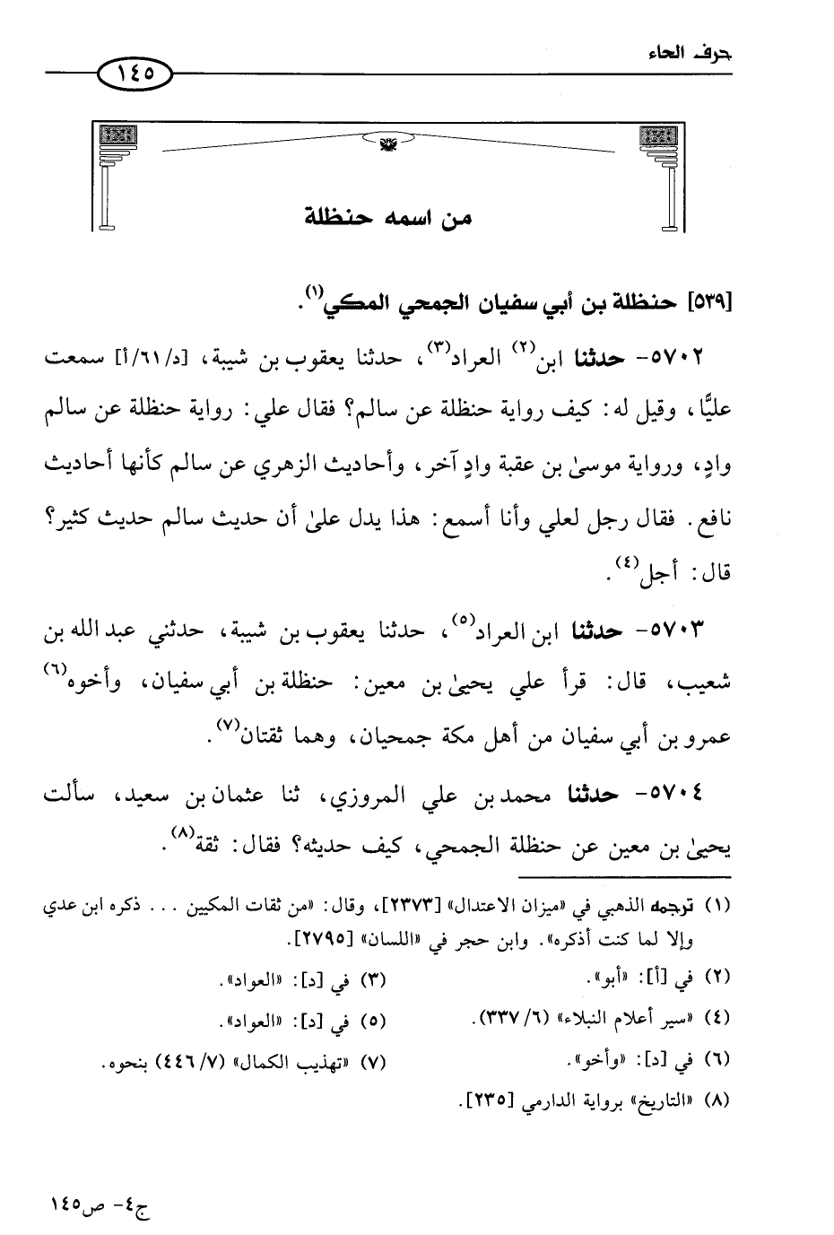 5703 - حَدثنا ابن العراد، حَدثنا يعقوب بن شيبة، حَدَّثني عَبد الله بن شُعَيب، قال: قرأ علي يحيى بن مَعين: حنظلة بن أبي سفيان وأخوه عَمرو بن أبي سفيان من أهل مكة، جمحيان، وهما ثقتان.
