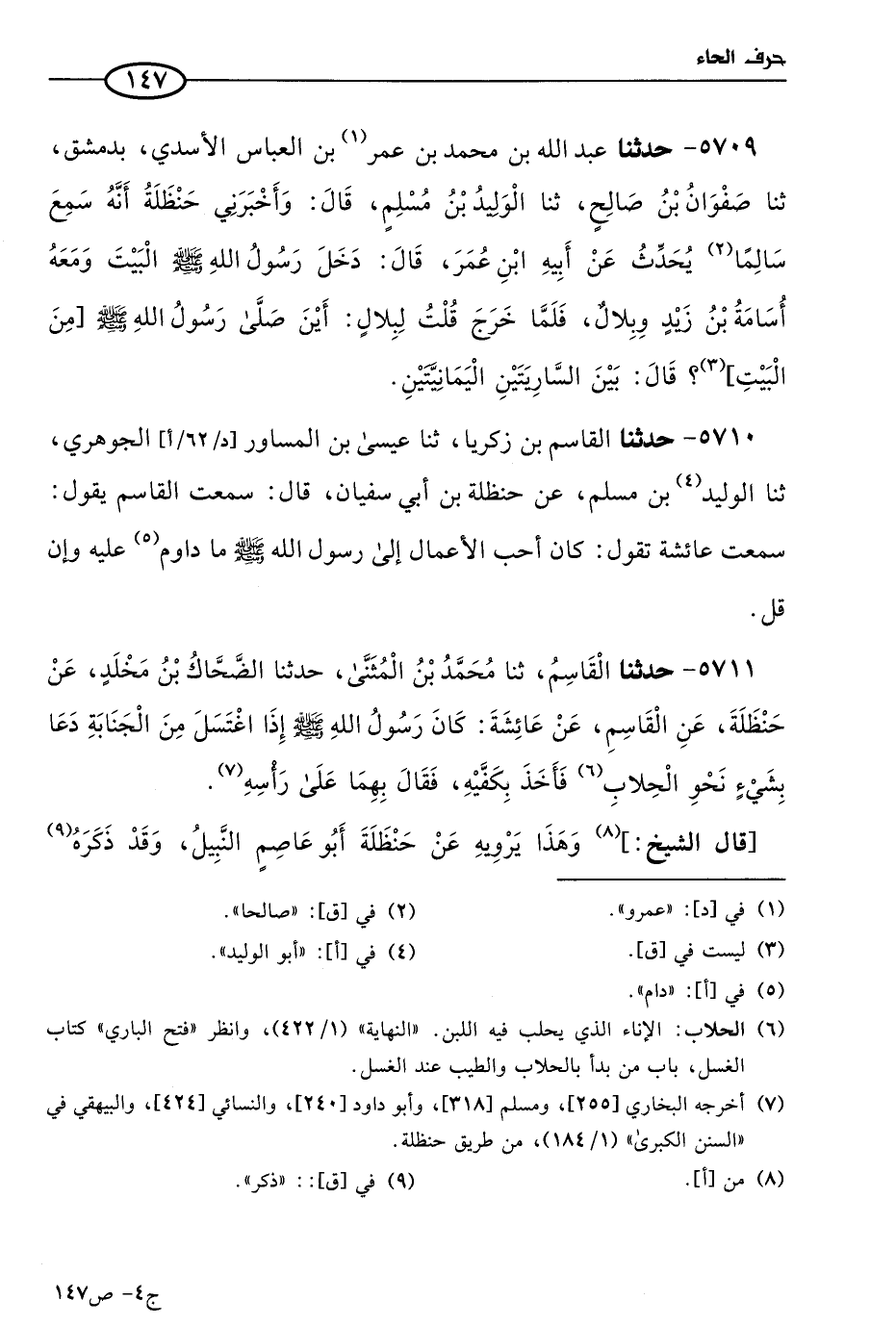 5710 - حَدثنا القاسم بن زكريا، حَدثنا عيسى بن المساور الجوهري، حَدثنا الوليد بن مسلم عن حنظلة بن أبي سفيان، قال: سمعتُ القاسم يقول: سَمعتُ عائشة تقول: كان أحب الأعمال إلى رسول الله صَلى الله عَليه وسَلم ما داوم عليه وإن قل.