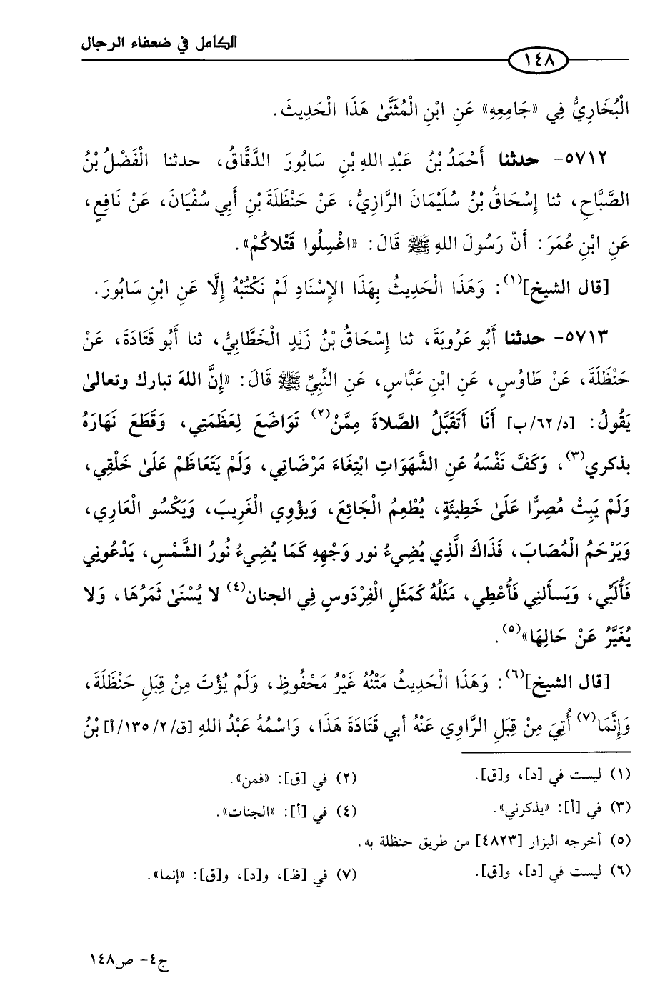 5712 - حَدثنا أحمد بن عَبد الله بن سابور الدقاق، حَدثنا الفضل بن الصباح، حَدثنا إسحاق بن سليمان الرازي، عن حنظلة بن أبي سُفيان، عن نافع، عن ابن عُمر، أَن رسُول الله صَلى الله عَليه وسَلم قال: اغسلوا قتلاكم.