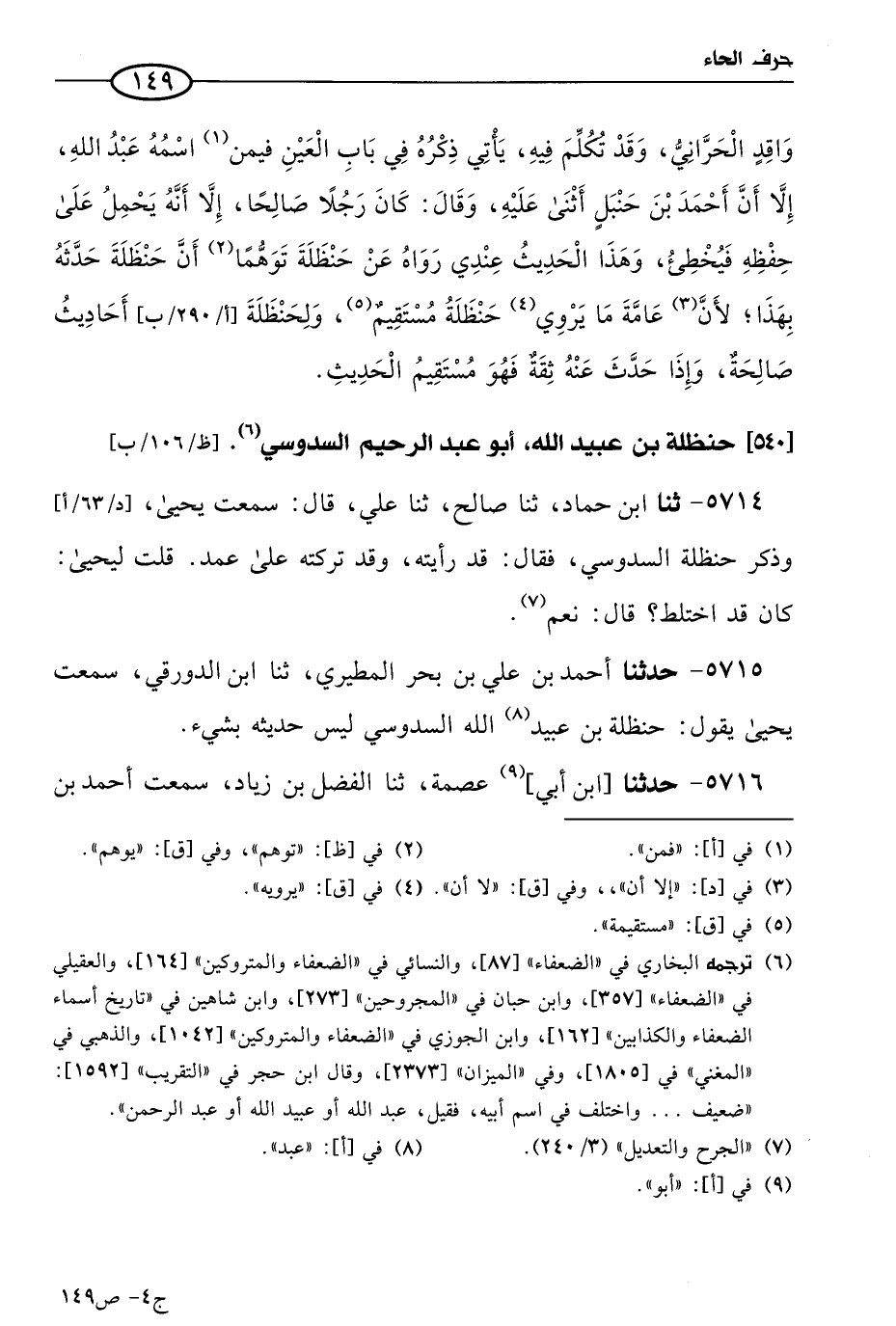 5714 - حَدثنا ابن حماد، حَدثنا صالح، حَدثنا علي، قال: سمعتُ يحيى، وذكر حنظلة السدوسي، فقال: قد رأيته وقد تركته على عمد. قلت ليحيى: كان قد اختلط؟ قال: نَعم.