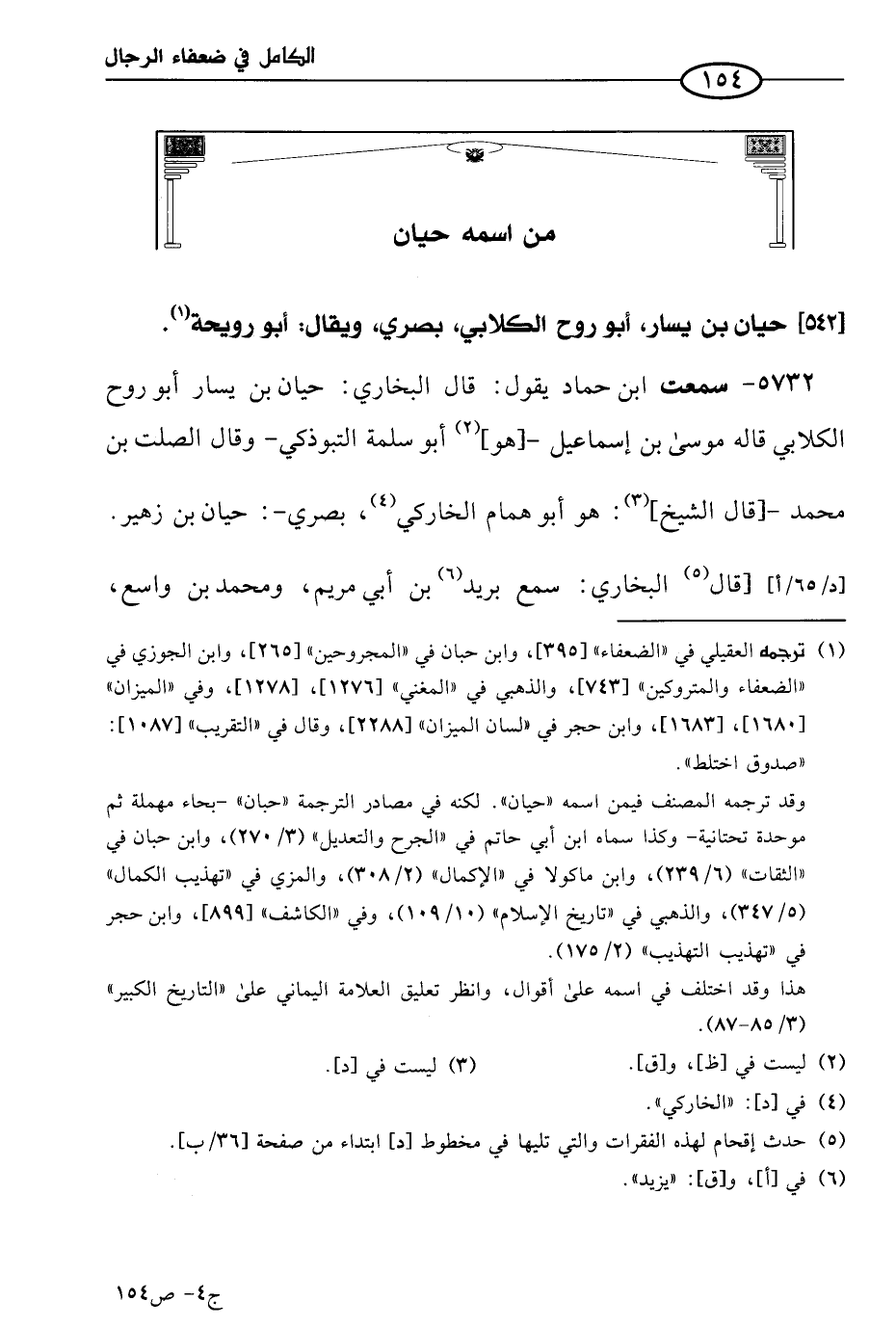 5732 - سمعتُ ابن حماد يقول: قال البُخاري: حِبَّان بن يسَار أَبو رَوح الكِلابي، قاله موسى بن إسماعيل، هو أَبو سلمة التبوذكي. وقال الصلت بن مُحمد- قال الشَّيخ: هو أَبو همام الخاركي بصري -: حَيان بن زُهَير (2)، قال البُخاري: سمع بُرَيد بن أبي مريم، ومُحمد بن واسع، وهشام بن عروة، وقال الصلت: رأيت حَيان آخر عمره، وذكر منه اختلاط، وهو بصري.