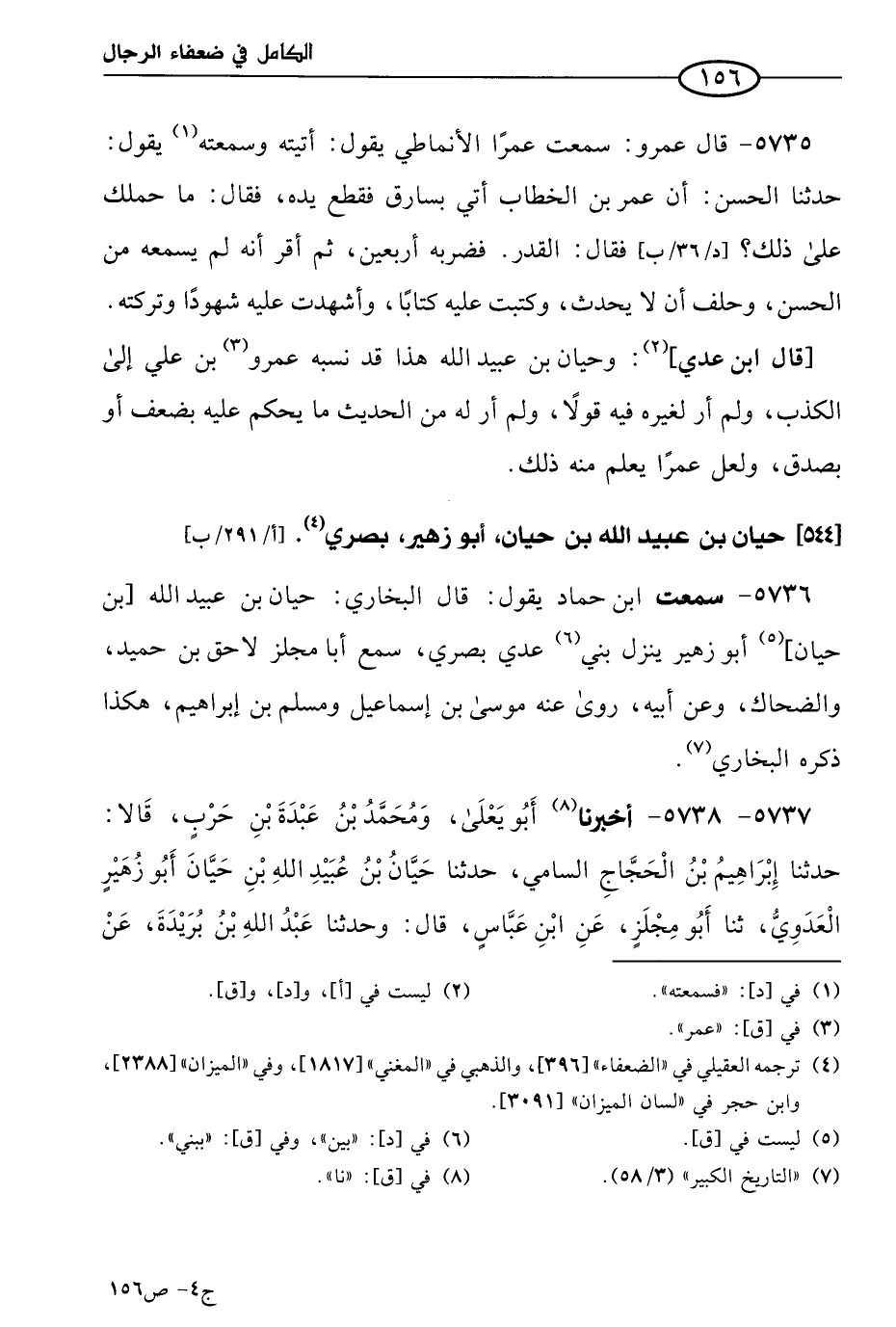 5735 - قال عَمرو: سمعت عمرا الأنماطي يقول: أتيته، وسمعته يقول: حَدثنا الحسن؛ أن عُمر بن الخطاب أتي بسارق فقطع يده، فقال: ما حملك على ذلك؟ فقال: القدر، فضربه أربعين. ثم أقر أنه لم يسمعه من الحسن وحلف أن لا يحَدِّثُ، وكتبت عليه كتابا وأشهدت عليه شهودا وتركته.