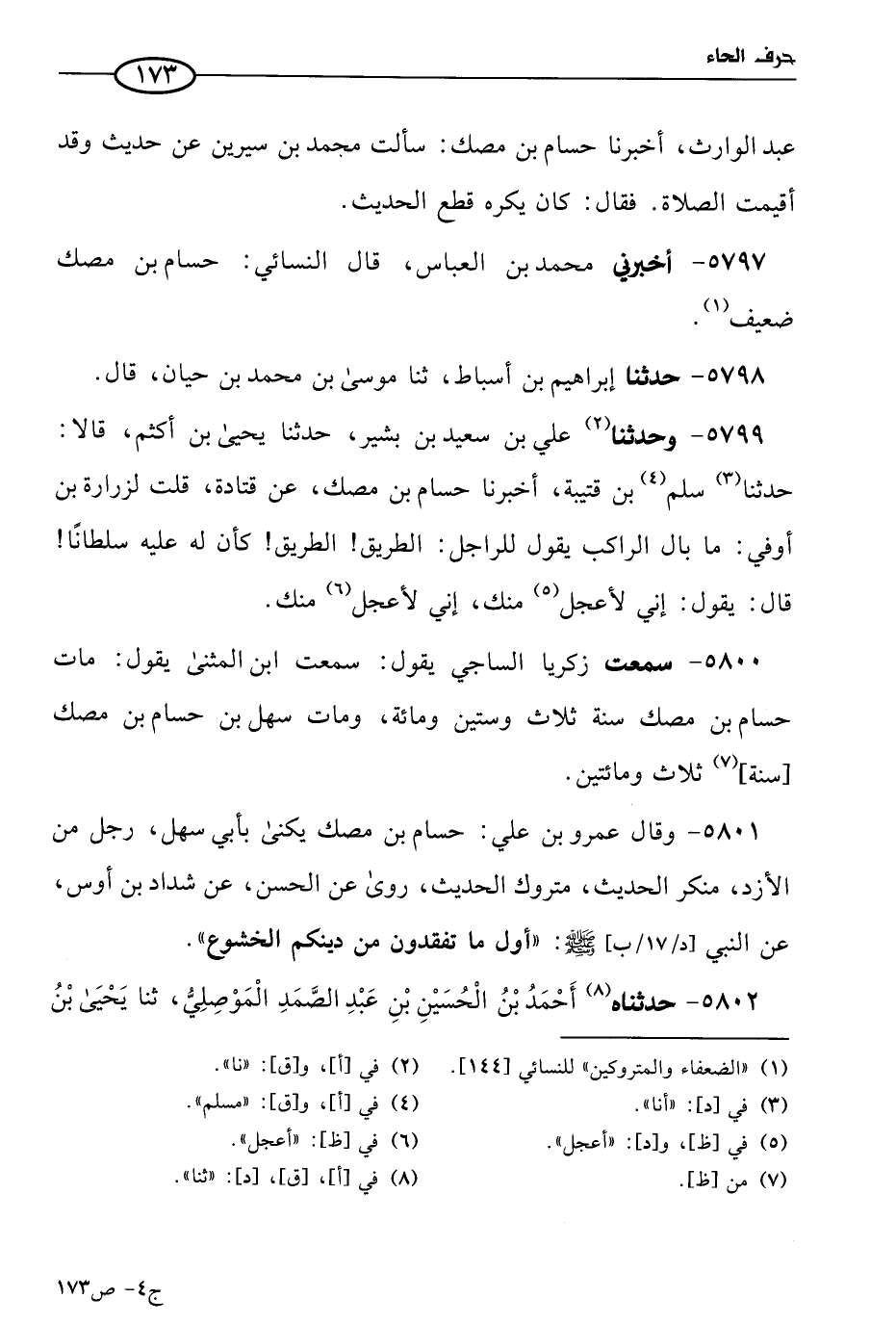 5800 - سمعت زكريا الساجي يقول: سَمعتُ ابن المثنى يقول: مات حسام بن مصك سنة ثلاث وستين ومِئَة، ومات سهل بن حسام بن مصك سنة ثلاث ومِئَتَين.