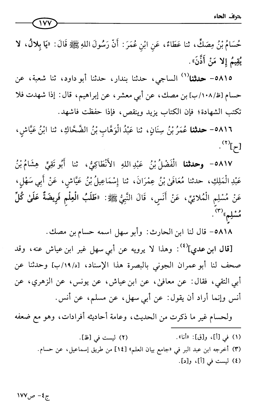 5817 - وحَدَّثنا الفضل بن عَبد الله الأنطاكي، حَدثنا أَبو تقي هشام بن عَبد الملك، حَدثنا مُعَافَى بن عمران، حَدثنا إسماعيل بن عياش، عن أبي سهل، عن مسلم الملائي، عن أَنَس، قال النبي صَلى الله عَليه وسلم: طلب العلم فريضة على كل مسلم.
