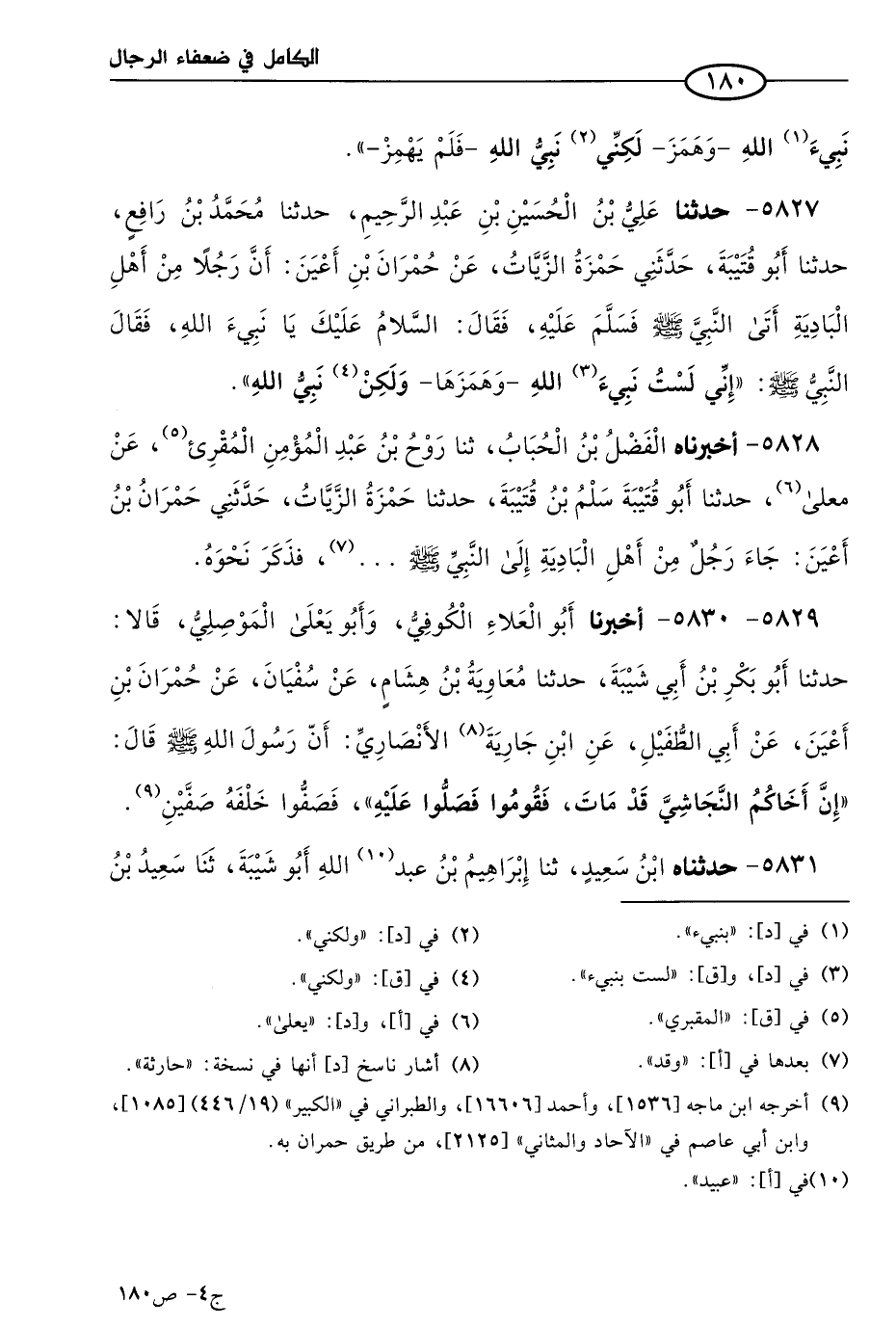 5827 - حَدثنا علي بن الحسين بن عَبد الرحيم، حَدثنا مُحمد بن رافع، حَدثنا أَبو قتيبة، حَدَّثني حمزة الزيات، عن حمران بن أعين؛ أن رجلاً من أهل البادية أتى النبي صَلى الله عَليه وسلم فسلم عليه فقال: السلام عليك يا نبيء الله، فقال النبي صَلى الله عَليه وسلم: إني لست نبيء الله، وهمزها، ولكن نبي الله.