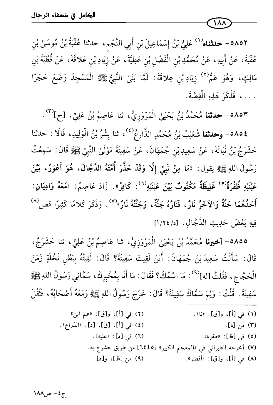 قال الشيخ: وهذه الأحاديث لحشرج، عن سعيد بن جُمهان، عن سفينة، وقد قمت بعذره في الحديث الذي أنكره البُخاري عليه، وأوردت بابا آخر لذلك الحديث ولذلك المتن، وغير ذلك الحديث لا بأس به فيه، وقد روى حشرج أَيضًا بهذا الإسناد: الخلافة بعدي ثلاثون.