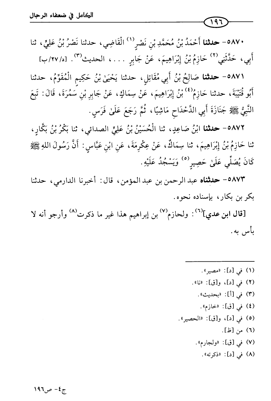 5872 - حَدثنا ابن صاعد، حَدثنا الحسين بن علي الصدائي، حَدثنا بكر بن بكار، حَدثنا حازم بن إبراهيم، حَدثنا سماك، عن عِكرمَة، عن ابن عباس؛ أَن رسُول الله صَلى الله عَليه وسلم كان يصلي على حصير ويسجد عليه.