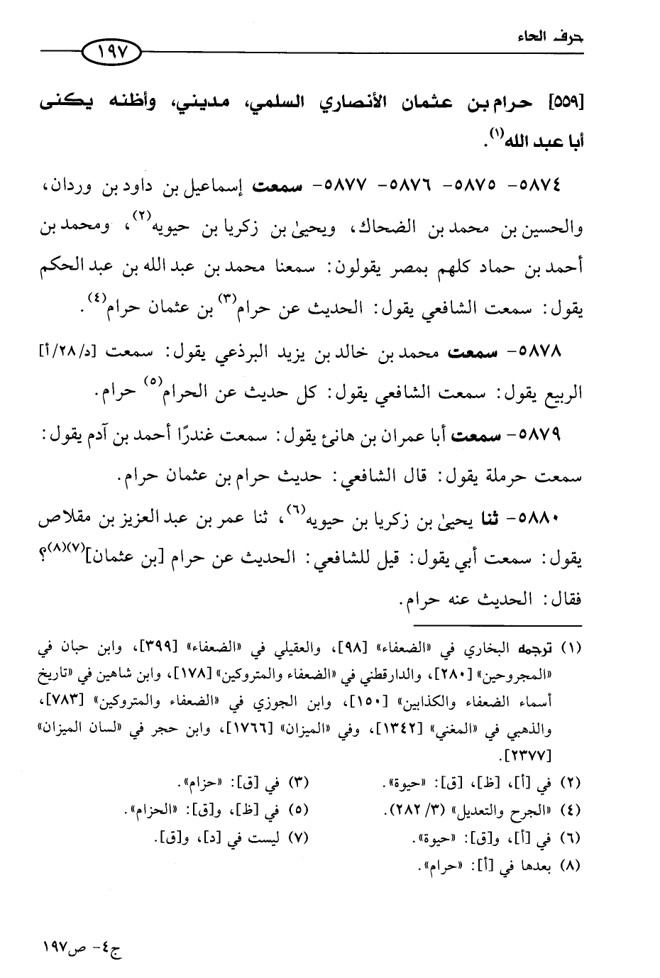 5874 - 5875 - 5876 - 5877 - سمعت إسماعيل بن داود بن وردان، والحُسَين بن مُحمد بن الضحاك، ويحيى بن زكريا بن حَيويه، ومُحمد بن أحمد بن حماد، كلهم بمصر، يقولون: سمعنا مُحمد بن عَبد الله بن عَبد الحكم يقول: سَمعتُ الشافعي يقول: الحديث عن حرام بن عثمان حرام.