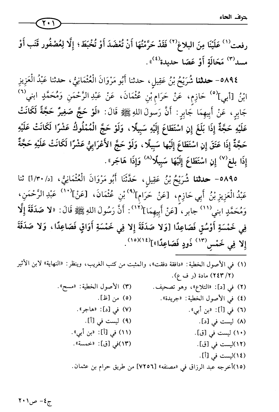 5895 - حَدثنا شريح بن عقيل، حَدثنا أَبو مروان العثماني، حَدثنا عَبد العزيز بن أبي حازم، عن حرام بن عثمان، عن عَبد الرحمن ومُحمد ابني جابر، عن أبيهما، أن رسول الله صَلى الله عَليه وسَلم قال: لا صدقة إلا في خمسة أوسق فصاعدا، ولا صدقة إلا في خمسة أواق فصاعدا، ولا صدقة إلا في خمس ذود فصاعدا.