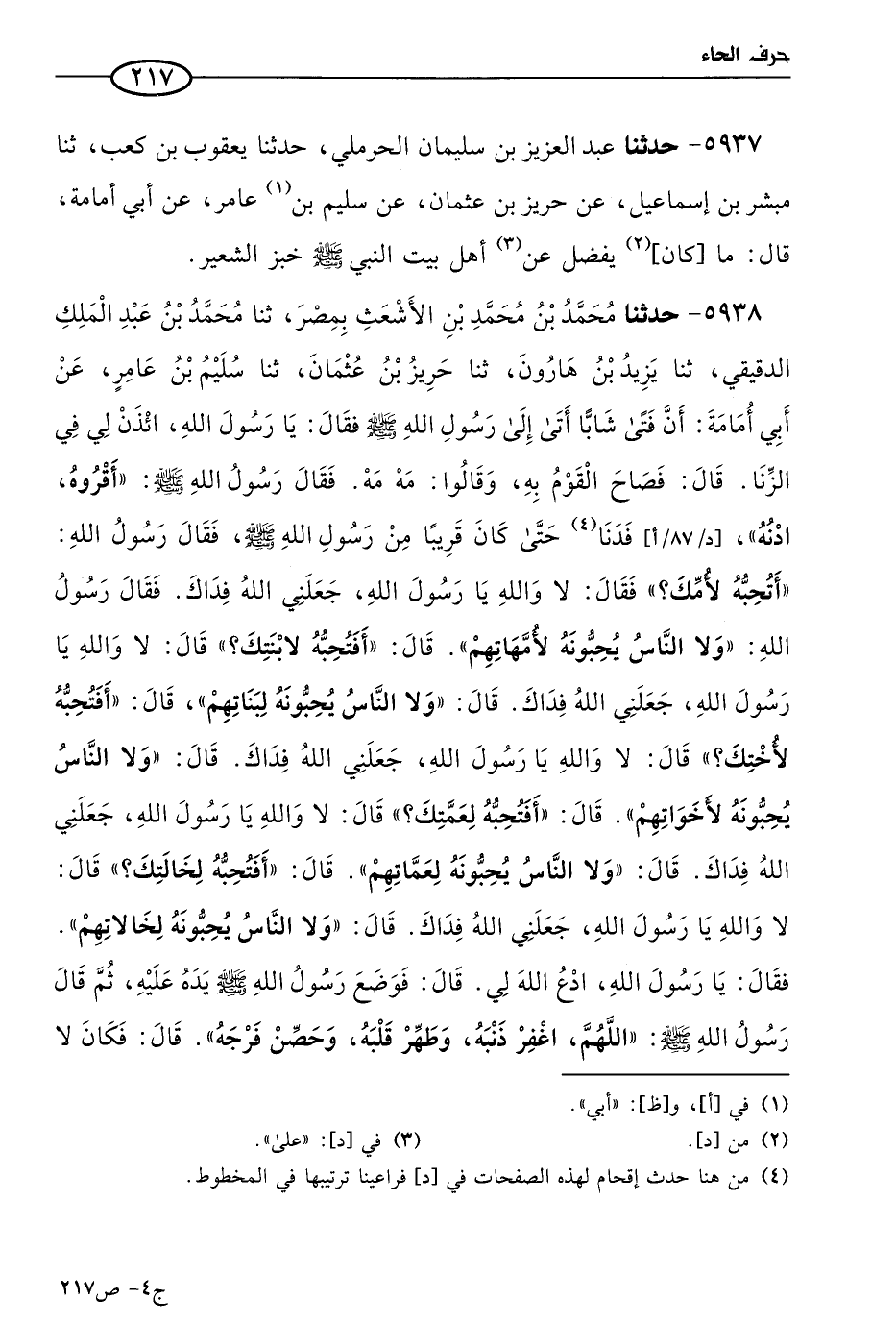 5938 - حَدثنا مُحمد بن مُحمد بن الأشعث بمصر، حَدثنا مُحمد بن عَبد الملك الدقيقي، حَدثنا يزيد بن هارون، حَدثنا حريز بن عثمان، حَدثنا سليم بن عامر، عن أَبي أُمامة؛ أن فتى شابا أتى إلى رسول الله صَلى الله عَليه وسَلم فقال: يا رسول الله، ائذن لي في الزنا، قال: فصاح القوم به وقالوا: مه مه، فقال رسول الله صَلى الله عَليه وسَلم: أقروه، ادنه، فدنا حتى كان قريبًا من رسول الله صَلى الله عَليه وسَلم، فقال رسول الله صَلى الله عَليه وسَلم: أتحبه لأمك؟ فقال: لا والله يا رسول الله، جعلني الله فداك، فقال رسول الله صَلى الله عَليه وسَلم: ولا الناس يحبونه لأمهاتهم، قال: أفتحبه لابنتك؟ قال: لا والله يا رسول الله جعلني الله فداك، قال: ولا الناس يحبونه لبناتهم، قال: أفتحبه لأختك؟ قال: لا والله يا رسول الله، جعلني الله فداك، قال: ولا الناس يحبونه لأخواتهم، قال: أفتحبه لعمتك؟ قال: لا والله يا رسول الله جعلني الله فداك، قال: ولا الناس يحبونه لعماتهم، قال: أفتحبه لخالتك؟ قال: لا والله يا رسول الله جعلني الله فداك، قال: ولا الناس يحبونه لخالاتهم، فقال: يا رسول الله، ادع الله لي، قال: فوضع رسول الله صَلى الله عَليه وسَلم يده عليه، ثم قال رسول الله صَلى الله عَليه وسلم: اللهم اغفر ذنبه وطهر قلبه وحصن فرجه، قال: فكان لا يلتفت إلى شيء بعد.