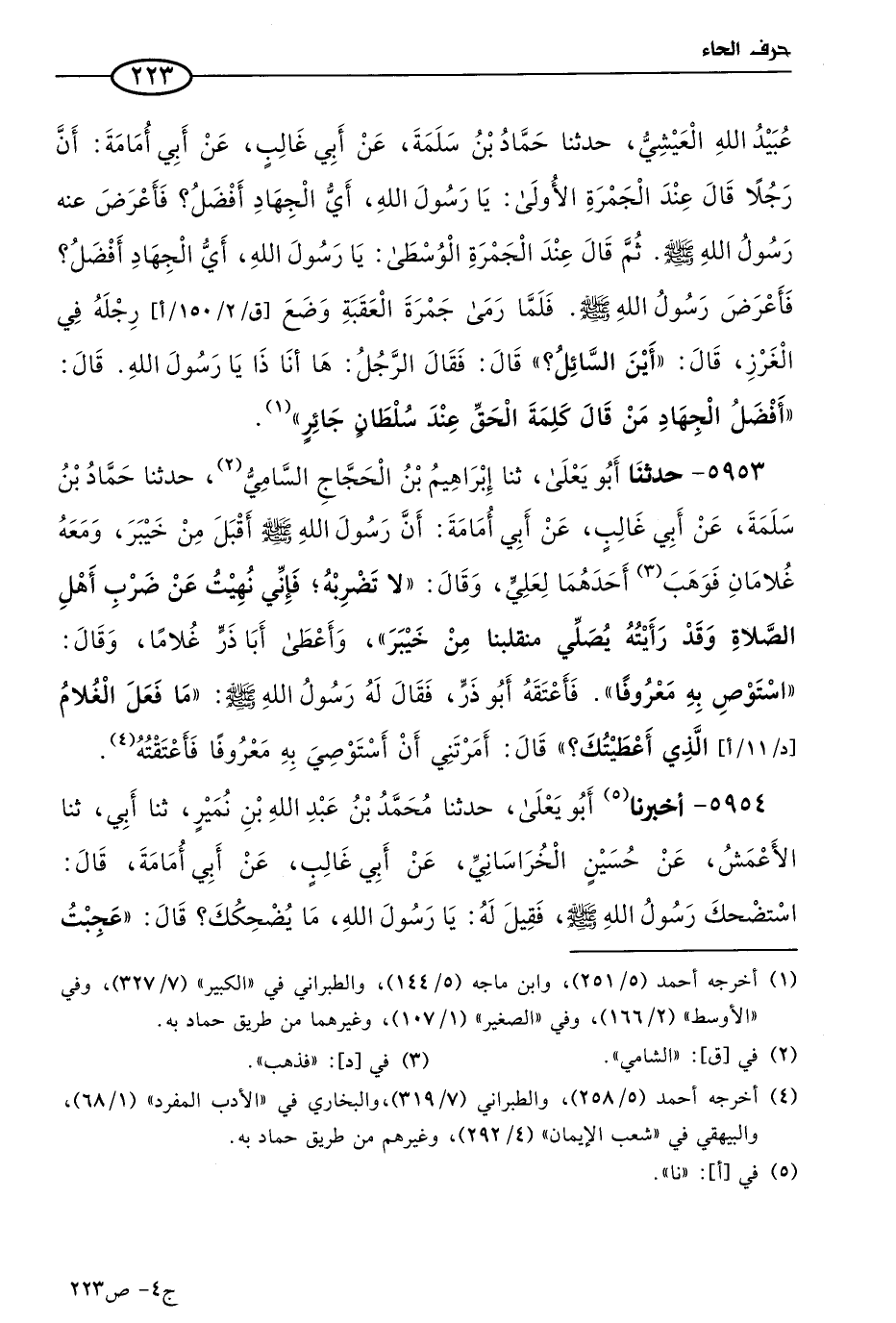 5953 - حَدثنا أَبو يعلَى، حَدثنا إبراهيم بن الحجاج السامي، حَدثنا حماد بن سلمة، عن أبي غالب، عن أبي أُمامة؛ أن رسول الله صَلى الله عَليه وسَلم أقبل من خيبر، ومعه غلامان، فوهب أحدهما لعلي، وقال: لا تضربه فإني نهيت عن ضرب أهل الصلاة، وقد رأيته يصلي منقلبا من خيبر وأعطى أبا ذر غلاما، وقال: استوص به معروفا، فأعتقه أَبو ذر، فقال له رسول الله صَلى الله عَليه وسَلم: ما فعل الغلام الذي أعطيتك؟ قال: أمرتني أن أستوصي به معروفا فأعتقته.