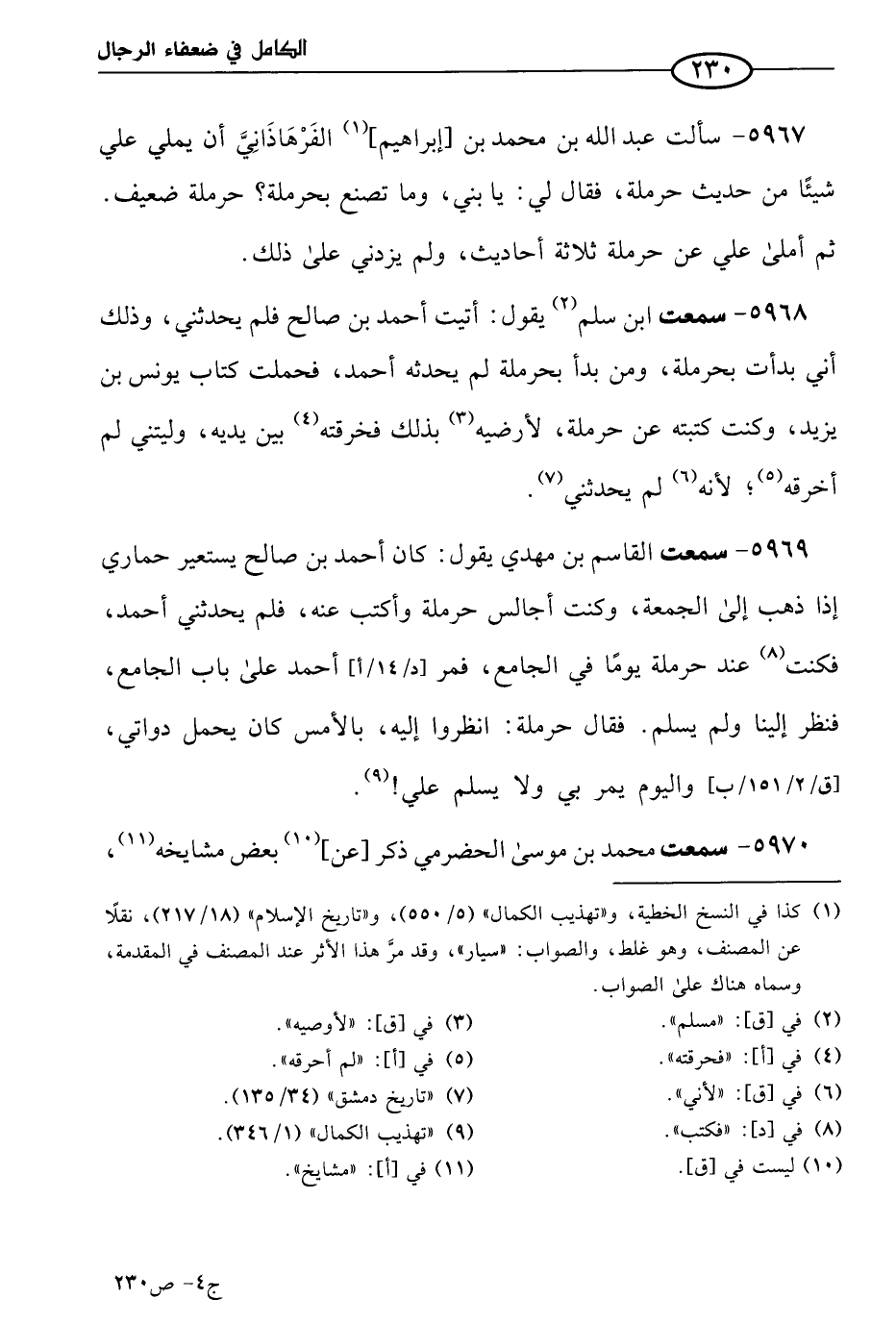 5967 - سألت عَبد الله بن مُحمد بن إبراهيم الفرهاذاني (1) يملي علي شيئا من حديث حرملة، فقال لي: يا بني وما تصنع بحرملة؟ حرملة ضعيف. ثم أملى علي عن حرملة ثلاثة أحاديث ولم يزدني على ذلك.