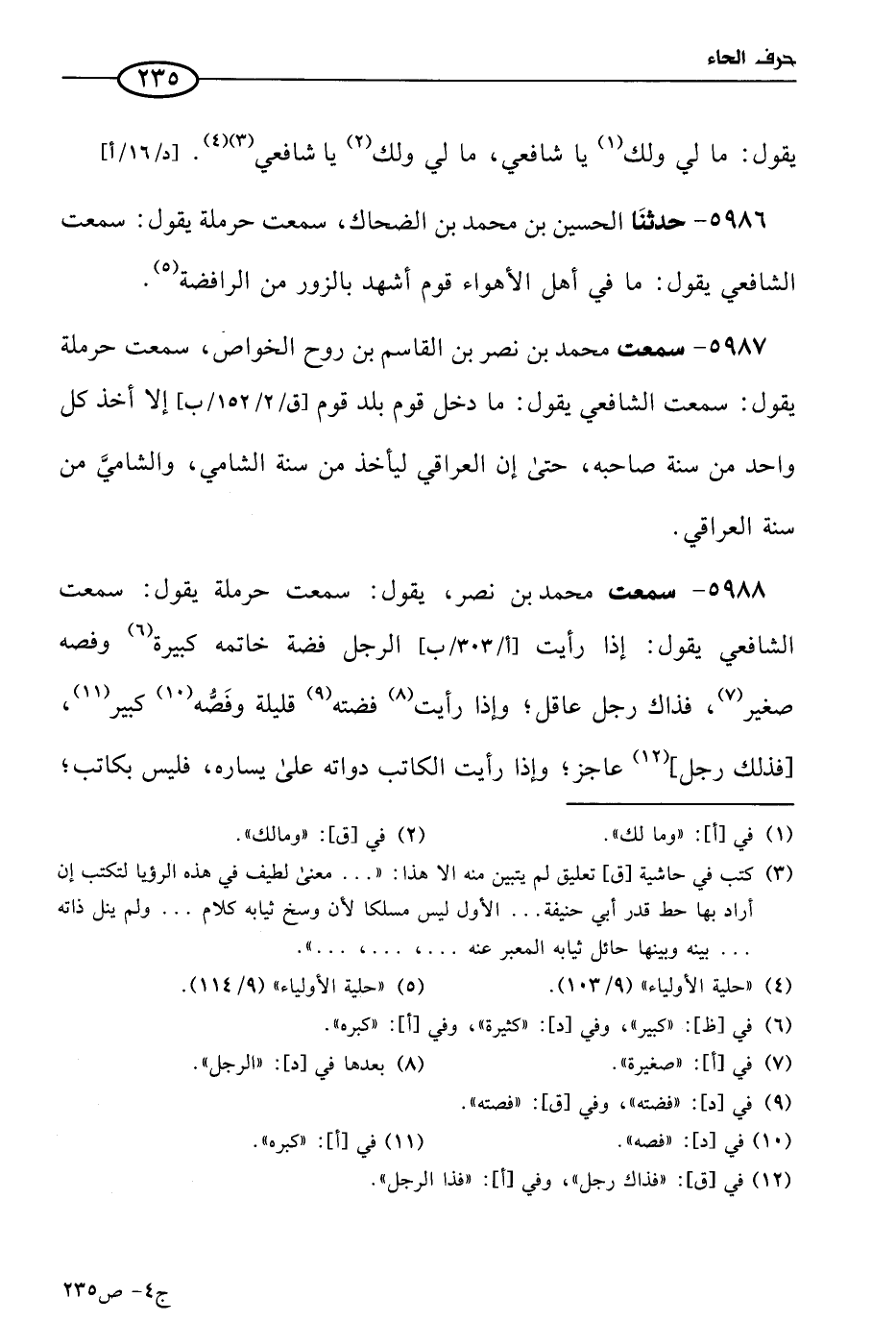 5986 - حَدثنا الحسين بن مُحمد بن الضحاك، سمعت حرملة يقول: سَمعتُ الشافعي يقول: ما في أهل الأهواء قوم أشهد بالزور من الرافضة.
