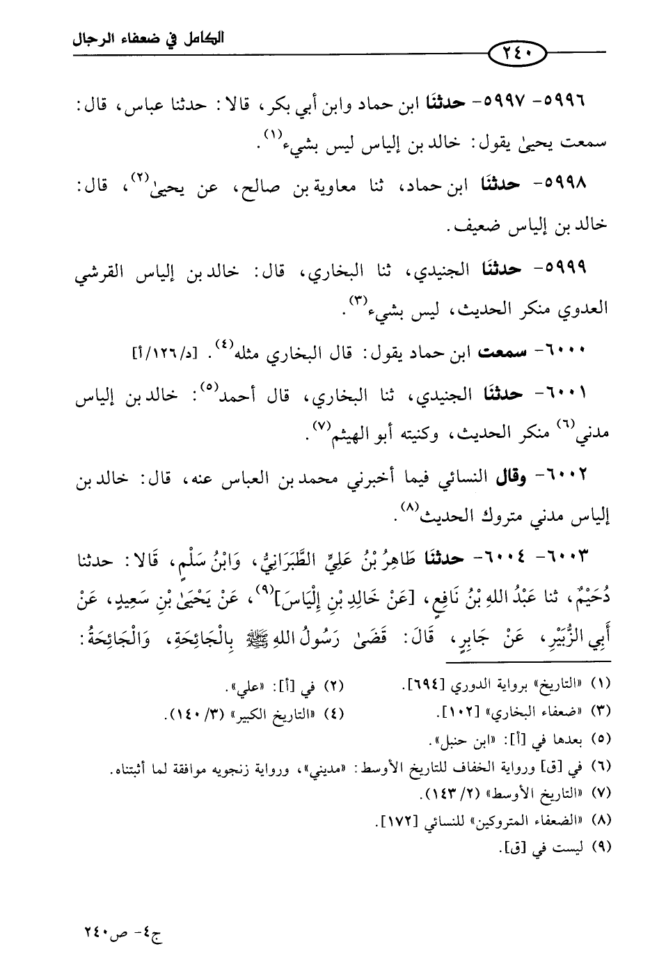 5999 - حَدثنا الجنيدي، حَدثنا البُخاري، قال: خالد بن إلياس القرشي العدوي، منكر الحديث ليس بشَيءٍ.