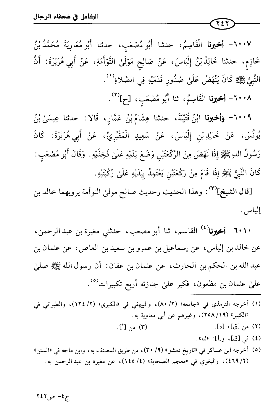 6010 - أخبرنا القاسم، حَدثنا أَبو مصعب، حَدَّثني مغيرة بن عَبد الرحمن، عن خالد بن إلياس عن إسماعيل بن عَمرو بن سعيد بن العاص، عن عثمان بن عَبد الله بن الحكم بن الحارث، عن عثمان بن عفان؛ أَن رسُول الله صَلى الله عَليه وسلم صلى على عثمان بن مظعون فكبر على جنازته أربع تكبيرات.