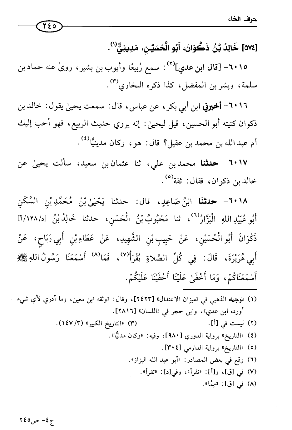 6017 - حَدثنا مُحمد بن علي، حَدثنا عثمان بن سعيد، سألت يحيى، عن خالد بن ذكوان، فَقال: ثِقةٌ.