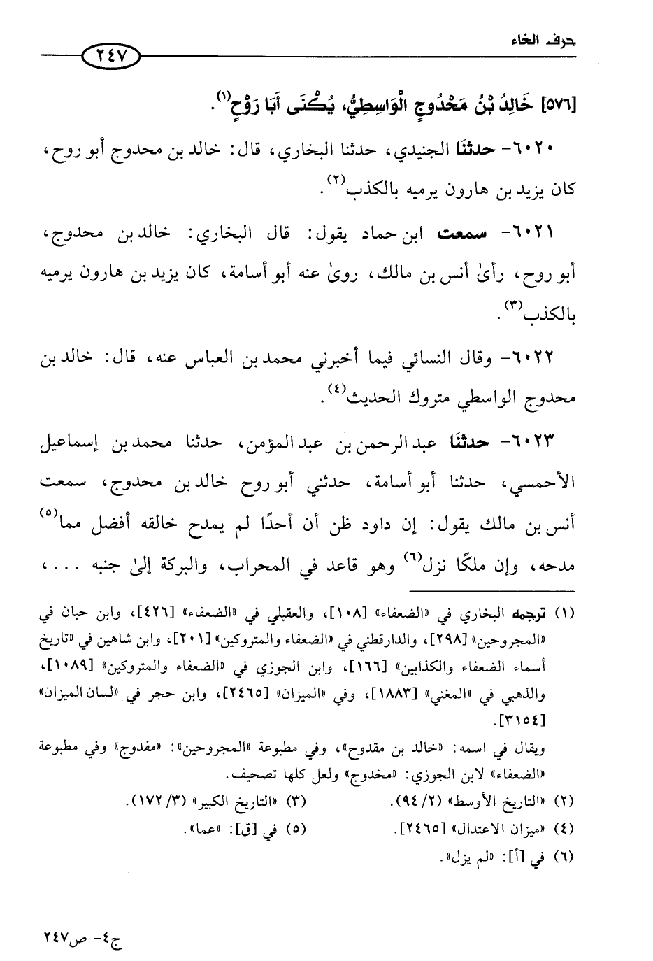 6021 - سمعتُ ابن حماد يقول: قال البُخاري: خالد بن محدوج أَبو روح رأى أنس بن مالك، روى عنه أَبو أسامة، كان يزيد بن هارون يرميه بالكذب.