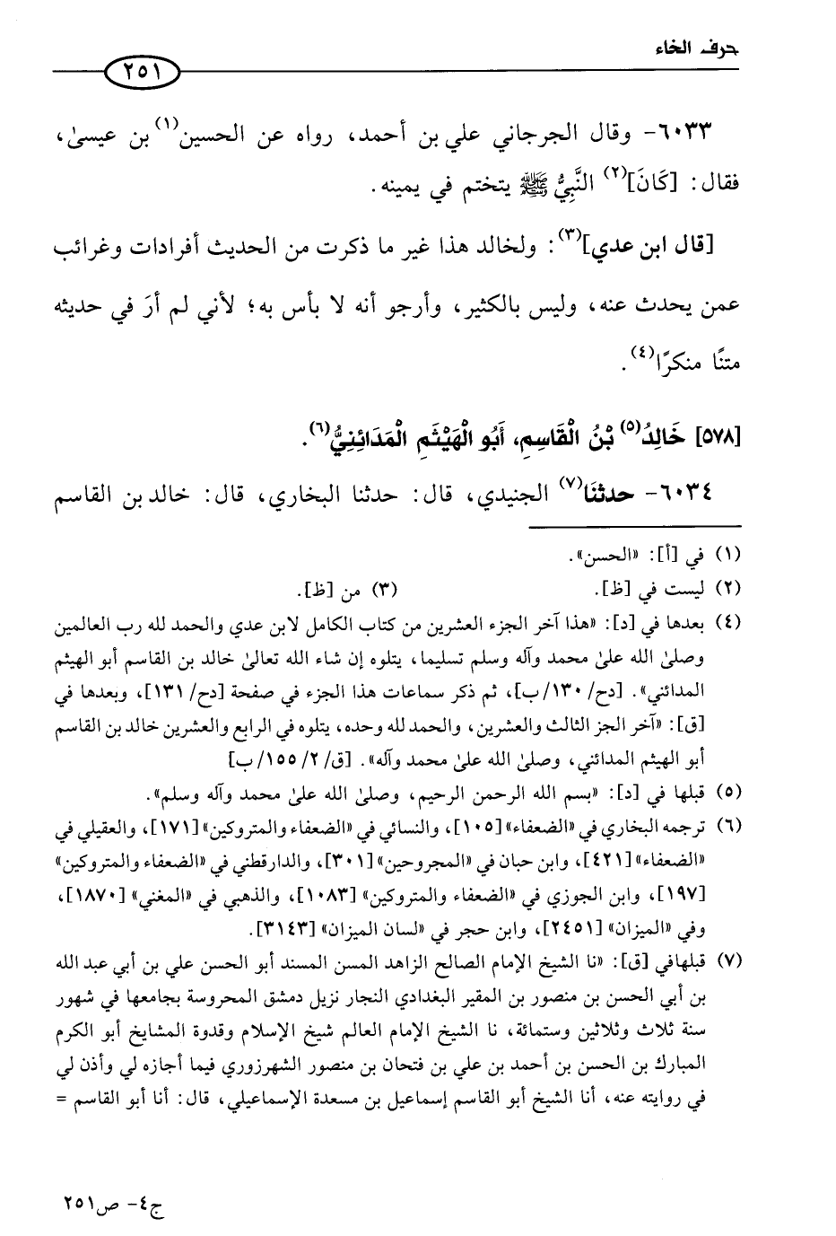 6034 - حَدثنا الجنيدي، قال: حَدثنا البُخاري، قال: خالد بن القاسم أَبو الهيثم المدائني تركه أحمد وعلي.