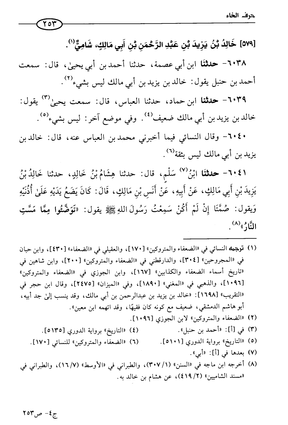 6038 - حَدثنا ابن أبي عصمة، حَدثنا أحمد بن أبي يحيى، قال: سمعتُ أحمد بن حنبل يقول: خالد بن يزيد بن أبي مالك ليس بشَيءٍ.