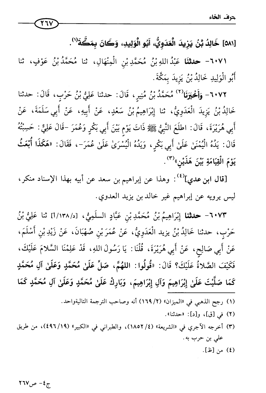 قال ابنُ عَدي: وهذا عن إبراهيم بن سعد عن أبيه بهذا الإسناد منكر، ليس يرويه عن إبراهيم غير خالد بن يزيد العدوي.