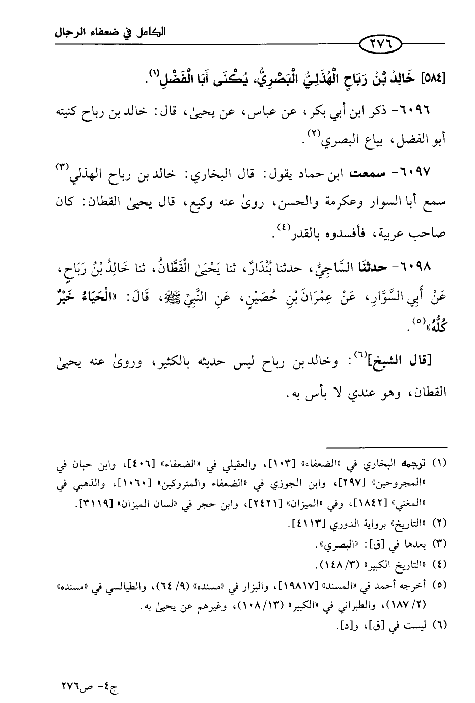 6097 - سمعتُ ابن حماد يقول: قال البُخاري: خالد بن رباح الهذلي، سمع أبا السوار وعكرمة والحسن، روى عنه وكيع. قال يحيى القطان: كان صاحب عربية فأفسدوه بالقدر.