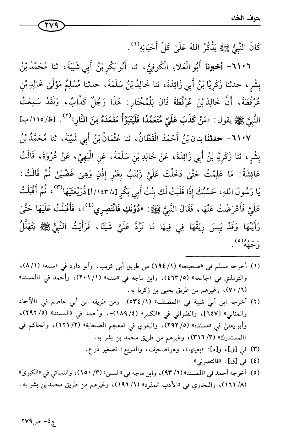 6106 - أخبرنا أَبو العلاء الكوفي، حَدثنا أَبو بكر بن أبي شيبة، حَدثنا مُحمد بن بشر، حَدثنا زكريا بن أبي زائدة، حَدثنا خالد بن سلمة، حَدثنا مسلم مولى خالد بن عرفطة، أن خالد بن عرفطة قال للمختار: هذا رجل كذاب، ولقد سمعت النبي صَلى الله عَليه وسلم يقول: مَن كذب علي متعمدا فليتبوأ مقعده من النار.