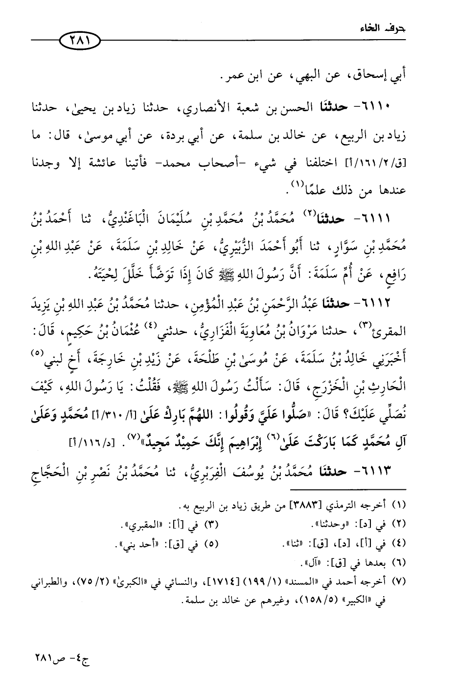 6112 - حَدثنا عَبد الرحمن بن عَبد المؤمن، حَدثنا مُحمد بن عَبد الله بن يزيد المقرئ، حَدثنا مروان بن معاوية الفزاري، حَدَّثني عثمان بن حكيم، قال: أخبرني خالد بن سلمة، عن موسى بن طلحة، عن زيد بن خارجة، أخ لبني الحارث بن الخزرج، قال: سَألتُ رسول الله صَلى الله عَليه وسَلم، فقلت: يا رسول الله، كيف نصلي عليك؟ قال: صلوا علي، وقولوا: اللهم بارك على مُحمد وعلى آل مُحمد كما باركت على إبراهيم إنك حميد مجيد.