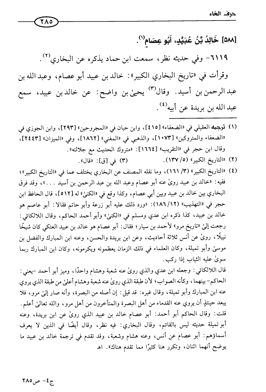 (1) في طبعتي العلمية والرشد: «خالد بن عُبيد، أَبو عصام، [و] عبد الله بن عَبد الرحمن بن أسيد»، وورد هكذا في «التاريخ الكبير» أيضا 3/ 161، وهو على الصواب في «الجرح والتعديل» 3/ 342، و «تهذيب الكمال» 8/ 125، و «ميزان الاعتدال» 2/ 452، و «لسانه» (4296).