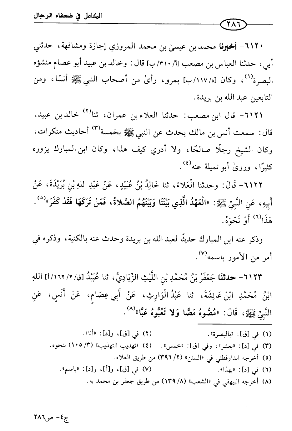 6121 - قال ابن مصعب: حَدثنا العلاء بن عمران، حَدثنا خالد بن عُبيد، قال: سمعتُ أنس بن مالك يحدث، عن النبي صَلى الله عَليه وسلم بخمسة أحاديث منكرات، وكان الشيخ رجلاً صالحا، ولا أدري كيف هذا، وكان ابن المبارك يزوره كثيرًا، وروى أَبو تميلة عنه.