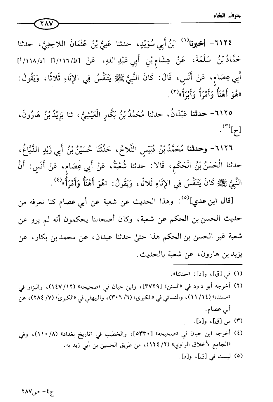 6124 - أخبرنا ابن أبي سويد، حَدثنا علي بن عثمان اللاحقي، حَدثنا حماد بن سلمة، عن هشام بن أبي عَبد الله، عن أبي عصام، عن أَنَس، قال: كان النبي صَلى الله عَليه وسلم يتنفس في الإناء ثلاثا ويقول: هو أهنأ وأمرأ وأبرأ.