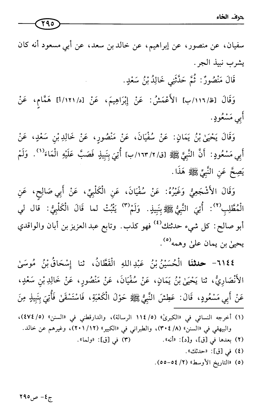 وقال يحيى بن يمان: عن سُفيان، عن منصور، عن خالد بن سعد، عن أبي مسعود؛ أن النبي صَلى الله عَليه وسلم أُتي بنبيذ فصب عليه الماء. ولم يصح عن النبي صَلى الله عَليه وسلم هذا.