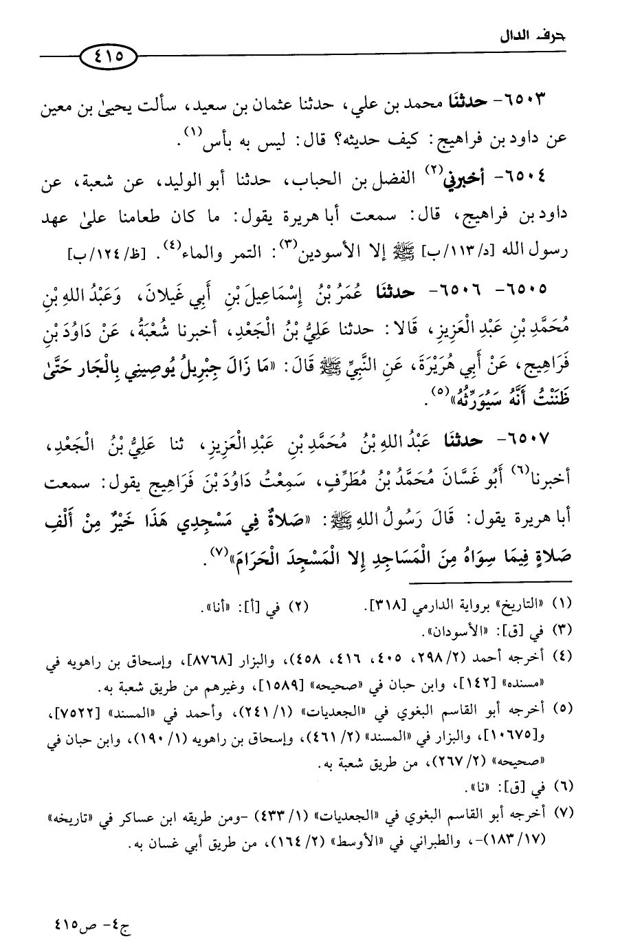 6507 - حَدثنا عَبد الله بن مُحمد بن عَبد العزيز، حَدثنا علي بن الجعد، أخبرنا أَبو غسان مُحمد بن مطرف، سمعت داود بن فراهيج يقول: سمعت أبا هريرة يقول: قال رسول الله صَلى الله عَليه وسلم: صلاة في مسجدي هذا خير من ألف صلاة فيما سواه من المساجد، إلا المسجد الحرام.