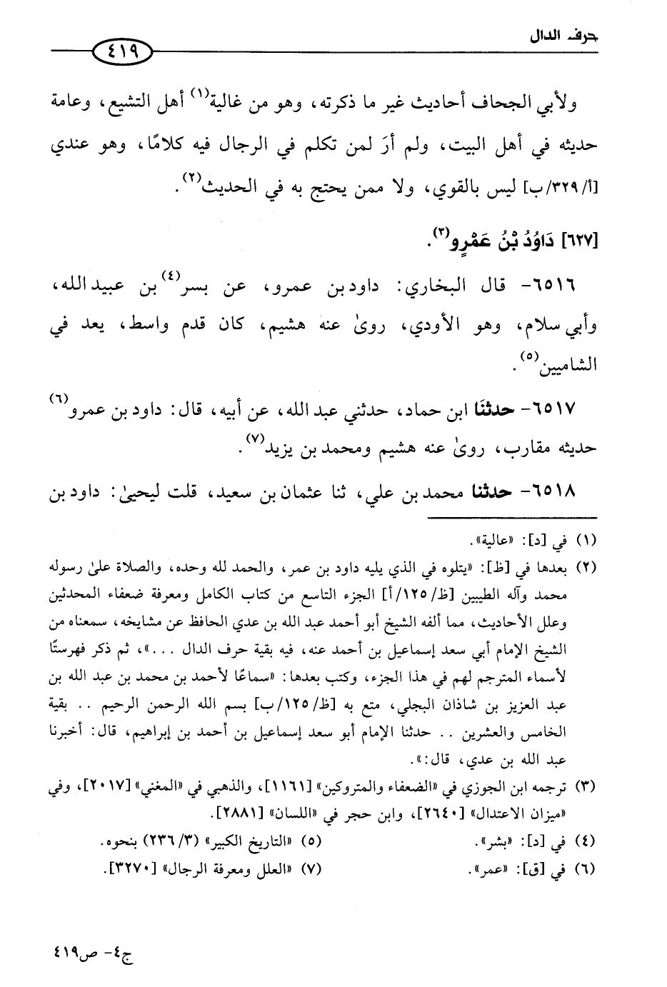 6518 - حَدثنا مُحمد بن علي، حَدثنا عثمان بن سعيد، قلت ليحيى: داود بن عَمرو الذي يروي عنه هشيم، ما حاله؟ قال: ثقةٌ.