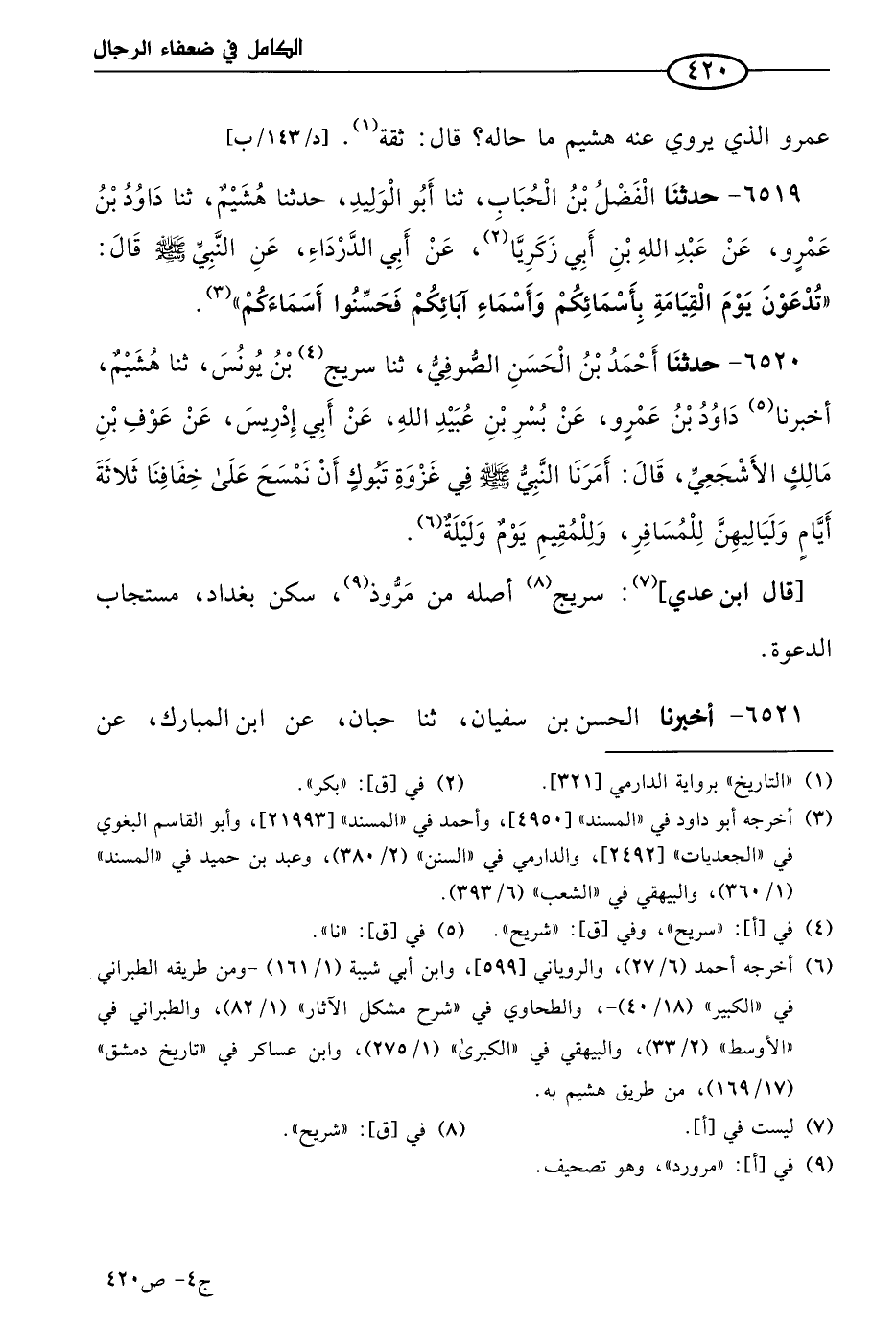 6519 - حَدثنا الفضل بن الحباب، حَدثنا أَبو الوليد، حَدثنا هشيم، حَدثنا داود بن عَمرو، عن عَبد الله بن أبي زكريا، عن أبي الدرداء، عن النبي صَلى الله عَليه وسَلم قال: تدعون يوم القيامة بأسمائكم وأسماء آبائكم، فحسنوا أسماءكم.