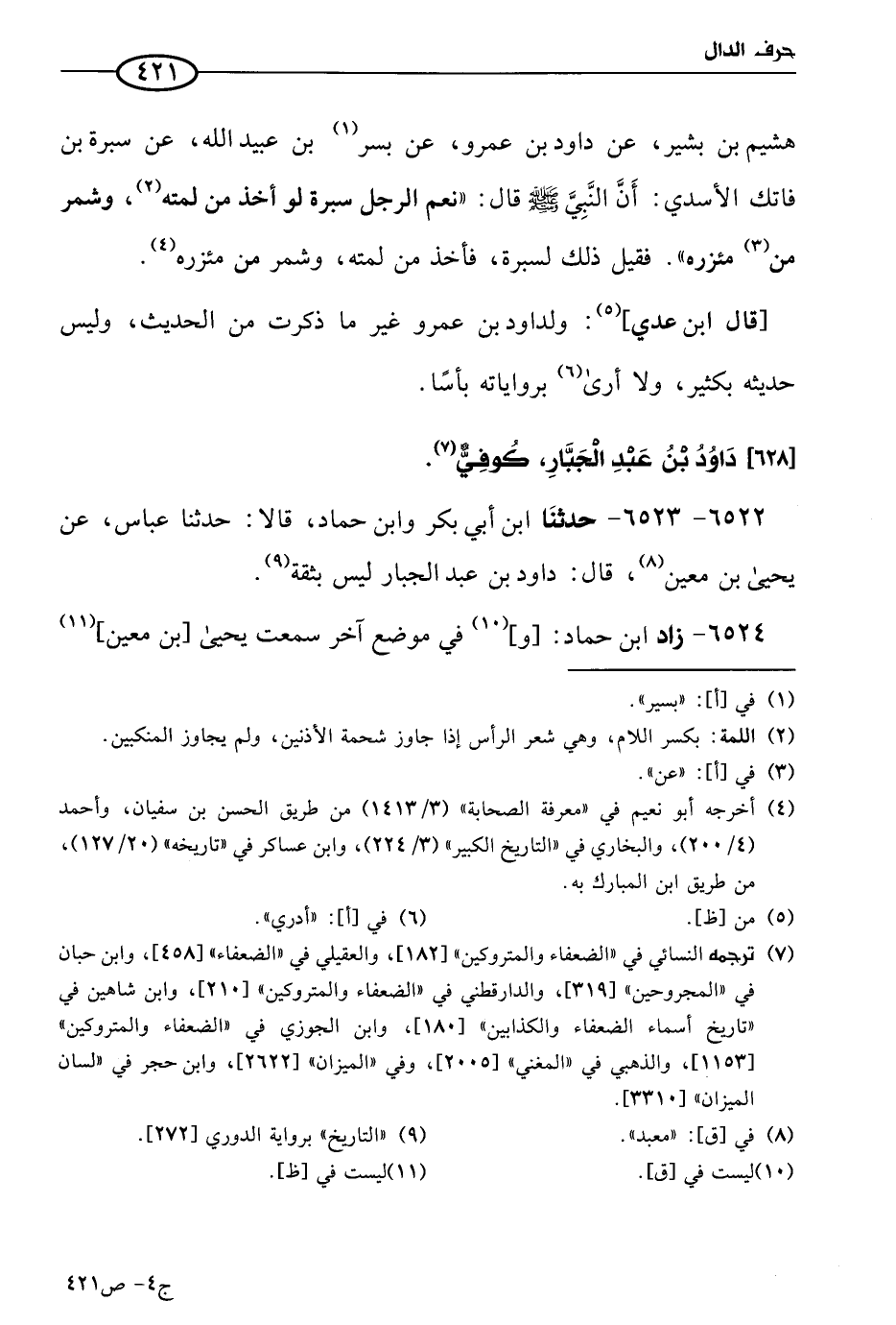 6524 - زاد ابن حماد: وفي موضعٍ آخر: سمعت يحيى بن مَعين يقول: داود بن عَبد الجبار كان ينزل باب الطاق، وقد رأيته، وكان يكذب.