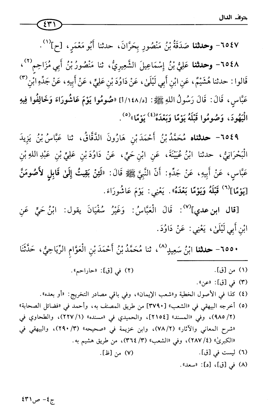6550 - حَدثنا ابن سعيد، حَدثنا مُحمد بن أحمد بن العوام الرياحي، حَدثنا أبي، حَدثنا الحارث بن النعمان بن سالم، عن سُفيان، عن داود بن علي، عن أبيه، عن ابن عباس، عن النبي صَلى الله عَليه وسَلم قال: صوموا عاشوراء.