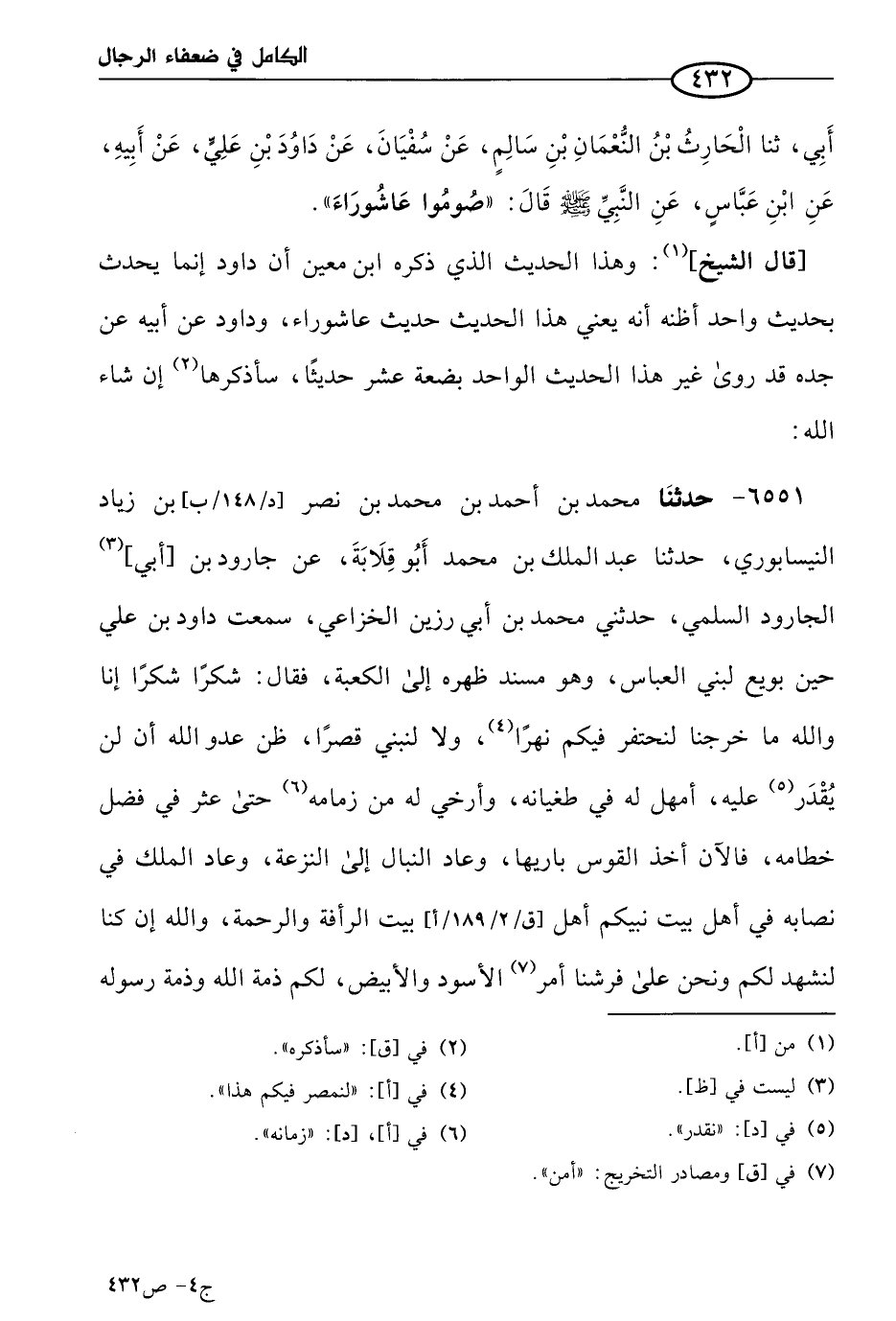 6551 - حَدثنا مُحمد بن أحمد بن مُحمد بن نصر بن زياد النيسابوري، حَدثنا عَبد الملك بن مُحمد أَبو قلابة، عن جارود بن أبي الجارود السلمي، حَدَّثني مُحمد بن أبي رزين الخزاعي، سمعت داود بن علي حين بويع لبني العباس، وهو مسند ظهره إلى الكعبة، فقال: شكرا شكرا، إنا والله ما خرجنا لنحتفر فيكم نهرا، ولا لنبني قصرا، ظن عدو الله أن لن يقدرعليه، أمهل له في طغيانه وأرخي له من زمامه حتى عثر في فضل خطامه، فالآن أخذ القوس باريها، وعاد النبال إلى النزعة، وعاد الملك في نصابه في أهل بيت نبيكم، أهل بيت الرأفة والرحمة، والله إن كنا لنشهد لكم ونحن على فرشنا أمر الأسود والأبيض، لكم ذمة الله وذمة رسوله وذمة العباس، ها ورب هذه البنية لا نهيج أحدًا ثم نزل.