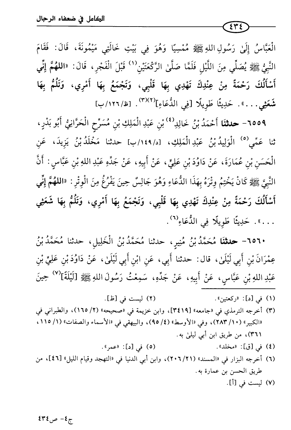 6559 - حَدثنا أحمد بن خالد بن عَبد الملك بن مسرح الحراني أَبو بدر، حَدثنا عمي الوليد بن عَبد الملك، حَدثنا مخلد بن يزيد، عن الحسن بن عمارة عن داود بن علي، عن أبيه، عن جَدِّه عَبد الله بن عباس؛ أن النبي صَلى الله عَليه وسلم كان يختم وتره بهذا الدعاء وهو جالس حين يفرغ من الوتر: اللهم إني أسألك رحمة من عندك، تهدي بها قلبي وتجمع بها أمري وتلم بها شعثي ... حديثًا طويلا في الدعاء.