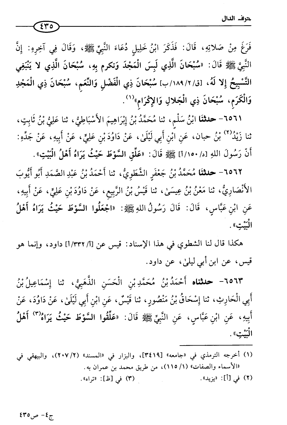 6562 - حَدثنا مُحمد بن جعفر الشطوي، حَدثنا أحمد بن عَبد الصمد أَبو أيوب الأنصاري، حَدثنا معن بن عيسى، حَدثنا قيس بن الربيع، عن داود بن علي، عن أبيه، عن ابن عباس، قال: قال رسول الله صَلى الله عَليه وسَلم: اجعلوا السوط حيث يراه أهل البيت.