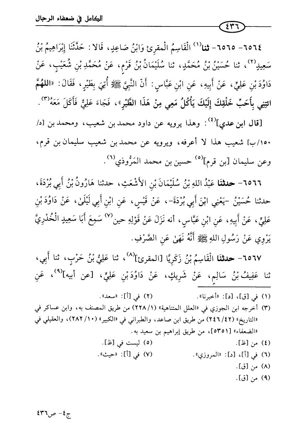 6564 - 6565 - حَدثنا القاسم المقرئ، وابن صاعد، قالا: حَدثنا إبراهيم بن سعيد، حَدثنا حسين بن مُحمد، حَدثنا سليمان بن قرم، عن مُحمد بن شُعَيب، عن داود بن علي، عن أبيه، عن ابن عباس؛ أن النبي صَلى الله عَليه وسلم أُتي بطير، فقال: اللهم ائتني بأحب خلقك إليك يأكل معي من هذا الطير، فجاء علي فأكل معه.