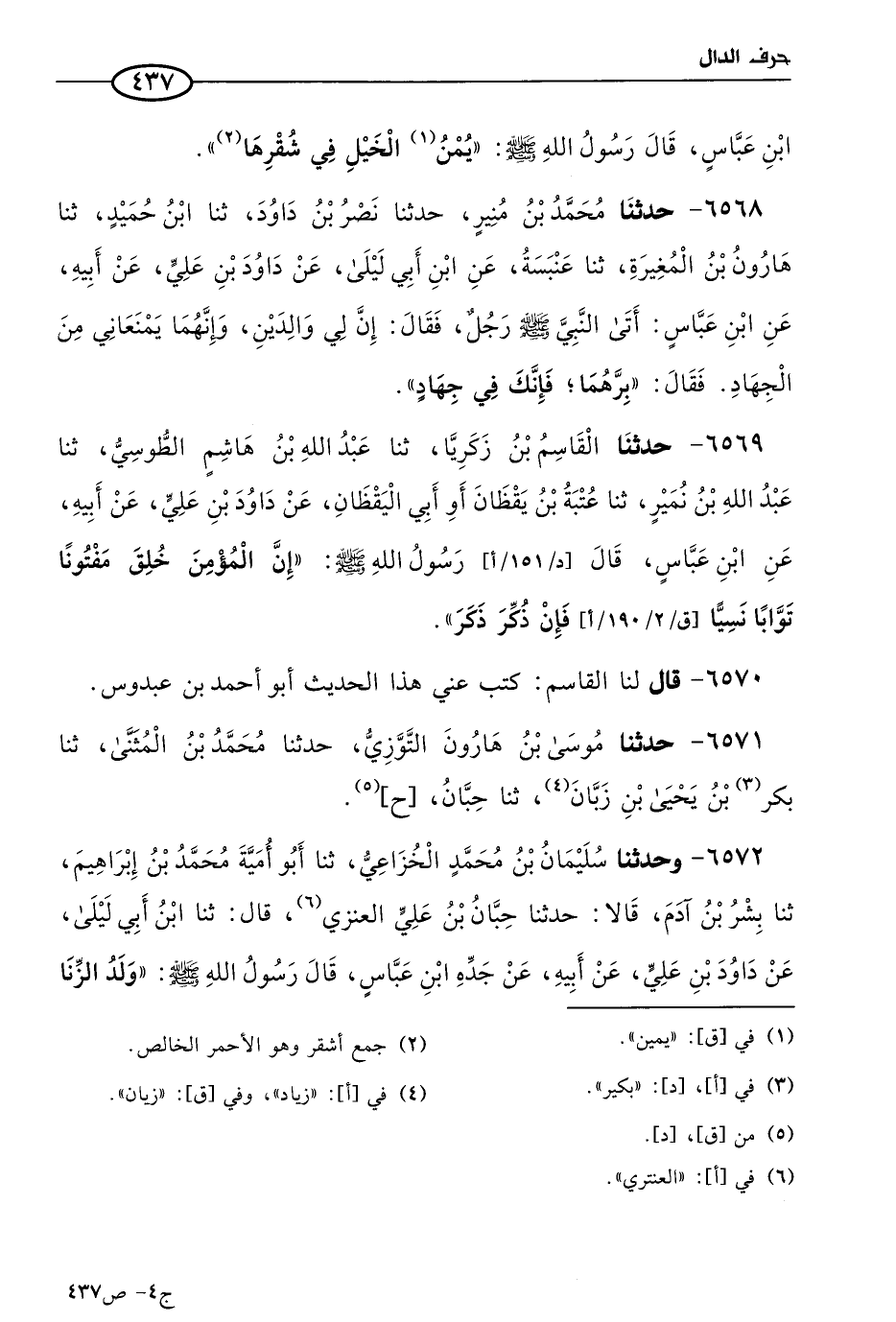 6568 - حَدثنا مُحمد بن منير، حَدثنا نصر بن داود، حَدثنا ابن حميد، حَدثنا هارون بن المغيرة، حَدثنا عنبسة، عن ابن أبي ليلى، عن داود بن علي، عن أبيه، عن ابن عباس؛ أتى النبي صَلى الله عَليه وسلم رجل فقال: إن لي والدَين وإنهما يمنعاني من الجهاد، فقال: برهما، فإنك في جهاد.