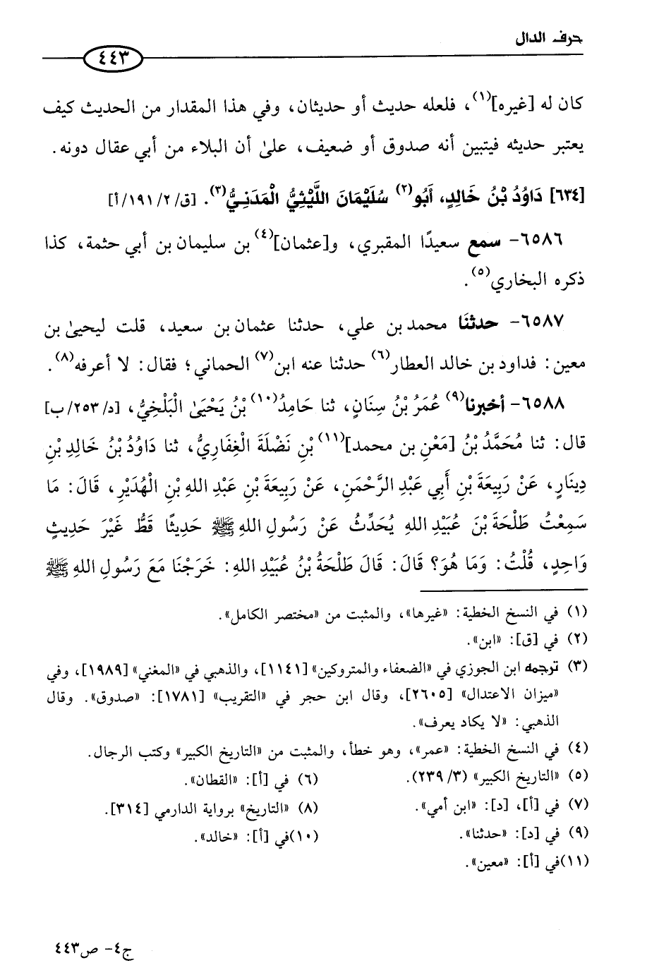 6587 - حَدثنا مُحمد بن علي، حَدثنا عثمان بن سعيد، قلتُ ليحيى بن مَعين: فداود بن خالد العطار، حَدثنا عنه ابن الحماني؟ فقال: لا أعرفه.