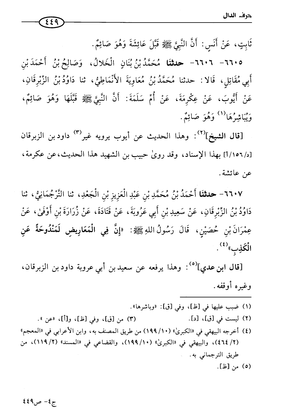 6607 - حَدثنا أحمد بن مُحمد بن عَبد العزيز بن الجعد، حَدثنا الترجماني، حَدثنا داود بن الزبرقان، عن سعيد بن أبي عَرُوبة، عن قَتادَة، عن زرارة بن أوفى، عن عمران بن حصين قال رسول الله صَلى الله عَليه وسلم: إن في المعاريض لمندوحة عن الكذب.