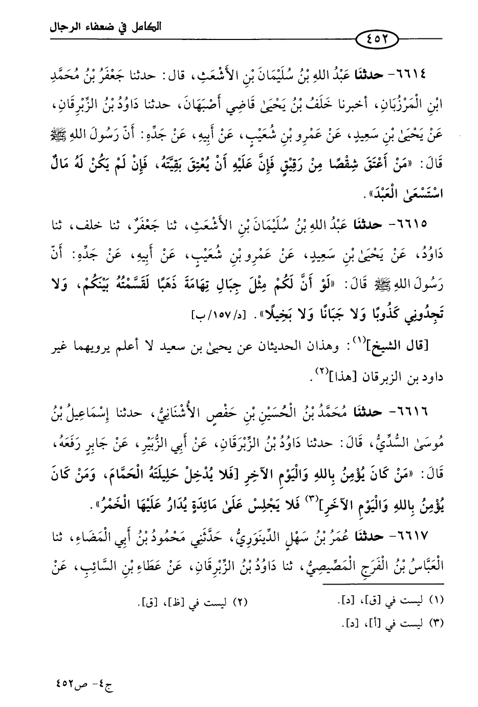 قال الشيخ: وهذان الحديثان عن يحيى بن سعيد لا أعلم يرويهما غير داود بن الزبرقان، هذا.