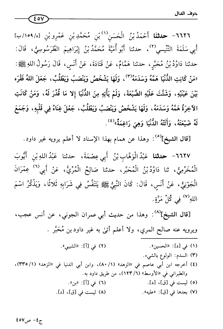 6626 - حَدثنا أحمد بن الحسن بن مُحمد بن عَمرو بن أبي سلمة التنيسي، حَدثنا أَبو أمية مُحمد بن إبراهيم الطرسوسي، قال: حَدثنا داود بن محبر، حَدثنا همام، عن قَتادَة، عن أَنَس، قال رسول الله صَلى الله عَليه وسلم: من كانت الدنيا همه وسدمه ولها يشخص وينصب ويطلب، جعل الله فقره بين عينيه وشتت عليه الضيعة ولم يأته من الدنيا إلا ما قدر له، ومن كانت الآخرة همه، وسدمه ولها يشخص وينصب ويطلب، جعل غناه في قلبه، وجمع له ضيعته وأتته الدنيا وهي راغمة.